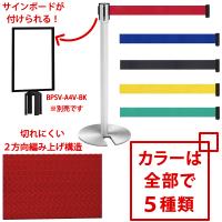お客様にお並び頂く際、サインボードだけでなくベルト自身の色でもご案内ができるように、赤・青・黒・黄・緑の5色のベルトをご用意しました。ベルトはポリエステル樹脂と言うナイロンロープに多く使われる材料を使用し、さらに2方向編み上げ構造によってより強度を増しています。