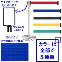 お客様にお並び頂く際、サインボードだけでなくベルト自身の色でもご案内ができるように、赤・青・黒・黄・緑の5色のベルトをご用意しました。ベルトはポリエステル樹脂と言うナイロンロープに多く使われる材料を使用し、さらに2方向編み上げ構造によってより強度を増しています。