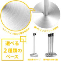 フラット型とU型の2種類のベースをご用意しております。日常的に設置したい場合はフラット型のベースが、常に収納することが考えられる場合は積み重ね収納可能なU型のベースがおすすめです。錆びにくいステンレス素材を使用し、さらに、ヘアーライン加工によって映り込みを防いでいるので、人が多く集まる場所でも安心してお使い頂けます。
