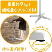 重量は約9kg!ベース・支柱部分は超軽量なアルミ素材を使用しております。男女問わず簡単に家具の設置・移動が可能な重量なので、テーブルを頻繁に移動する必要がある場合におすすめです。また、アルミ脚は細かい高さ調整が可能なアジャスターを4個装備しております。床の凹凸に合わせて調整することができるため、ガタつかない安定した設置が可能です。