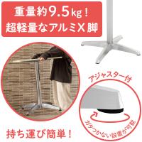 重量は約9.5kg!ベース・支柱部分は超軽量なアルミ素材を使用しております。男女問わず簡単に家具の設置・移動が可能な重量なので、テーブルを頻繁に移動する必要がある場合におすすめです。また、アルミ脚は細かい高さ調整が可能なアジャスターを4個装備しております。床の凹凸に合わせて調整することができるため、ガタつかない安定した設置が可能です。