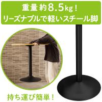 ホワイト・ナチュラル・ダークブラウン、3種類のカラーバリエーションの他、超軽量なアルミ十字脚・アルミ十字黒脚、軽量なスチール脚、重厚なステンレス丸脚・ステンレス角脚の、5種類の脚のバリエーションをご用意しております。さらに、丸天板・四角天板の2種類の天板バリエーションもご用意!お部屋やお店の広さ、使用用途に合わせてお好きなテーブルをお選びいただけます。