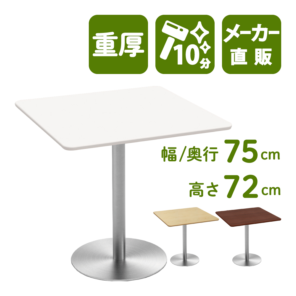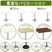 カフェ用、オフィスの休憩室用、ご自宅用などなど・・・様々な場面でお使いいただける、シンプルなデザインのカフェテーブルです。丸天板・四角天板からお選びいただける他、ホワイト、ナチュラル、ダークブラウンの3カラー、さらに、幅60cm、幅75cmの2サイズをご用意しております。