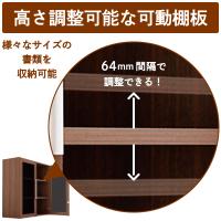 キャビネット内部に設置されている棚板は、高さ調整が可能な可動棚板です。64mm間隔で調整でき、内側の差し込み穴に金具を引っ掛け、棚板を金具の上に乗せるだけで簡単に棚の位置を調整することができます。そのため、A4以外のサイズの書類もピッタリとたくさん収納することが可能です。