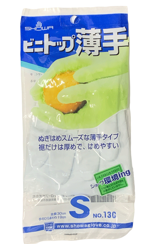 商品詳細 | 「ビニトップ薄手 No.130」は、薄手タイプのため、手にフィットして指先感覚が活かせる塩化ビニール素材の手袋です。手のひらから指先まで、独自パターンのスベリ止め加工を施しているため、高いスベリ止め効果を発揮します。手袋内面を特殊被膜でコーティングし、ぬぎはめしやすいスリップオン加工を施しています。また、手袋の裾部分を少し厚めに加工しているので、持ちやすく、ぬぎはめしやすくなっています。 |