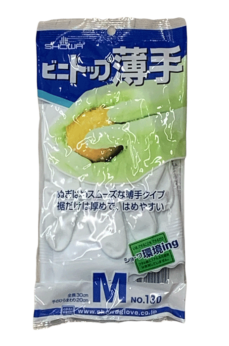 商品詳細 | 「ビニトップ薄手 No.130」は、薄手タイプのため、手にフィットして指先感覚が活かせる塩化ビニール素材の手袋です。手のひらから指先まで、独自パターンのスベリ止め加工を施しているため、高いスベリ止め効果を発揮します。手袋内面を特殊被膜でコーティングし、ぬぎはめしやすいスリップオン加工を施しています。また、手袋の裾部分を少し厚めに加工しているので、持ちやすく、ぬぎはめしやすくなっています。 |