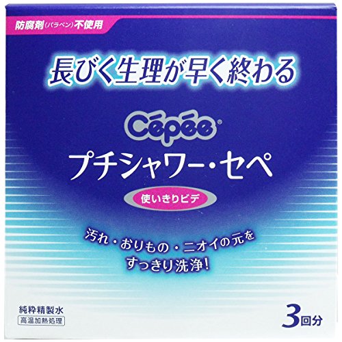 商品詳細 | 女性の膣内の汚れや雑菌を取り除く、使いきりビデ(膣内洗浄器)です。生理やオリモノがある時などは、膣内の自浄作用が低下し、雑菌が入りやすくなります。セペは安心な精製水シャワーで膣内の汚れ、ニオイの元を取り除き、膣本来の自浄作用の回復を促します。生理の終わりかけ2〜3日にセペで洗い流せば、不快感もスッキリ解消、長びく生理も早く終わります。オリモノが気になるときや、スポーツや海、プールの後にもお使いいただけます。3回分です。 |
