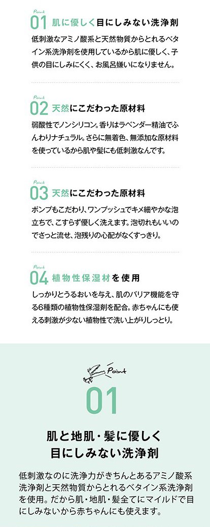 水、BG、コカミドプロピルベタイン、グリセリン、ミリスタミドプロピルベタイン、ココイルグリシンNa 、ココイルグルタミン酸K、ミリスチルベタイン、ステアリン酸スクロース、フェノキシエタノール、ラベンダー油、クエン酸、クエン酸Na、アルニカ花エキス、キュウリ果実エキス、セイヨウキズタ葉/茎エキス、セイヨウニワトコ花エキス、ゼニアオイ花エキス、パリエタリアエキス