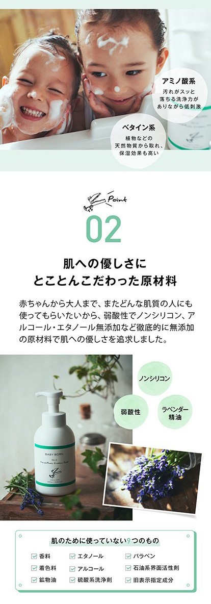 BABY BORN Face&Body Creamy Soap 赤ちゃん 子供 ベビーソープ ベビーシャンプー ボディソープ 無添加 泡タイプ 石鹸 全身 大容量 ラベンダーの香り