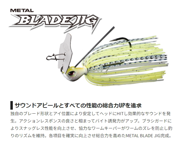 独自のブレード形状とアイ位置により安定してヘッドにHITし効果的なサウンドを発生。アクションレスポンスの良さと相まってバイト誘発力がアップ。ブラシガードによりスナッグレス性能を向上させ、協力なワームキーパーがワームのズレを防止し釣りのリズムを維持。各項目を確実に向上させ総合力を高めたMETAL BLADE JIG完成。