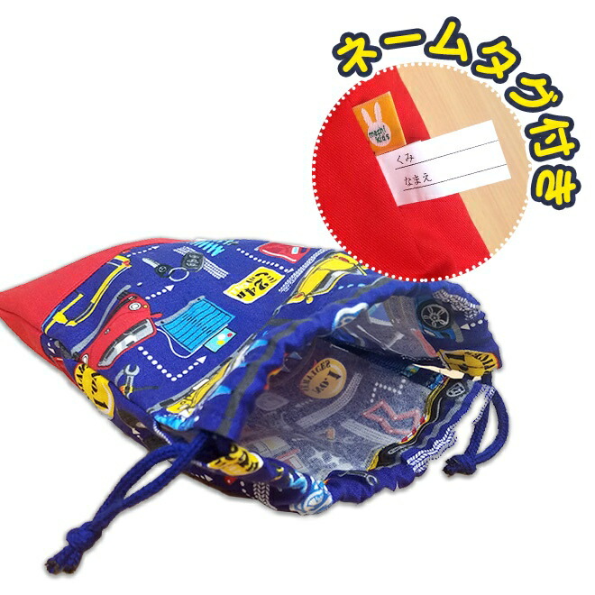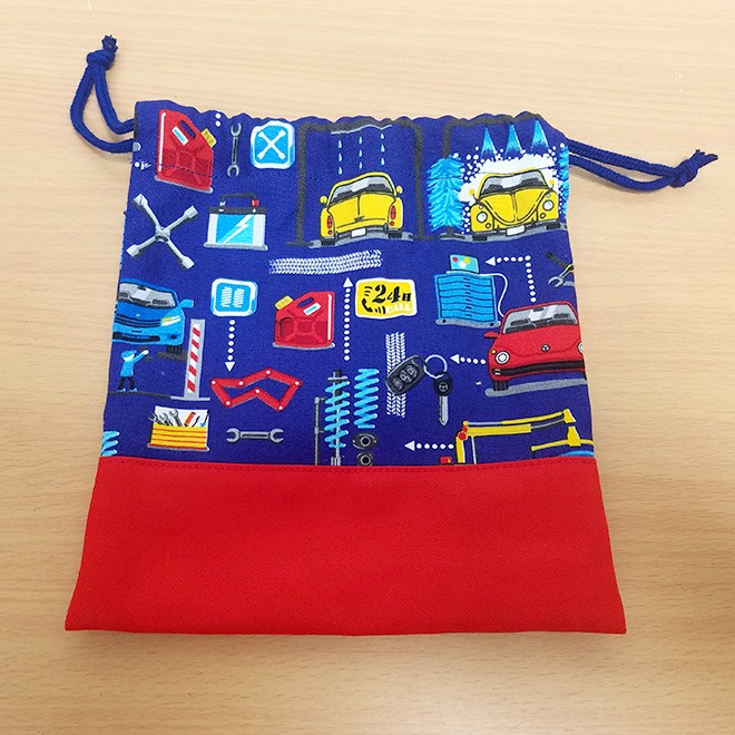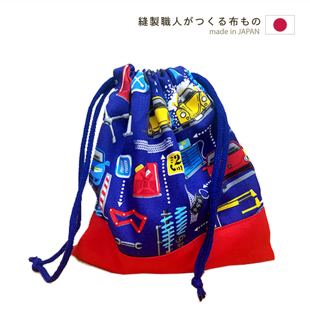 巾着袋 小 小さい 小さめ ミニ 軽量 丈夫 長持ち しっかり 洗える 手洗い可 洗濯機可 かっこいい カッコいい 格好良い カッコイイ クール 車 車好き くるま のりもの ブルー 青 手作り 職人 国産 布製 ハンドメイド 生地 おすすめ 日本製 布 人気 メイドインジャパン 縫製が丁寧 袋物