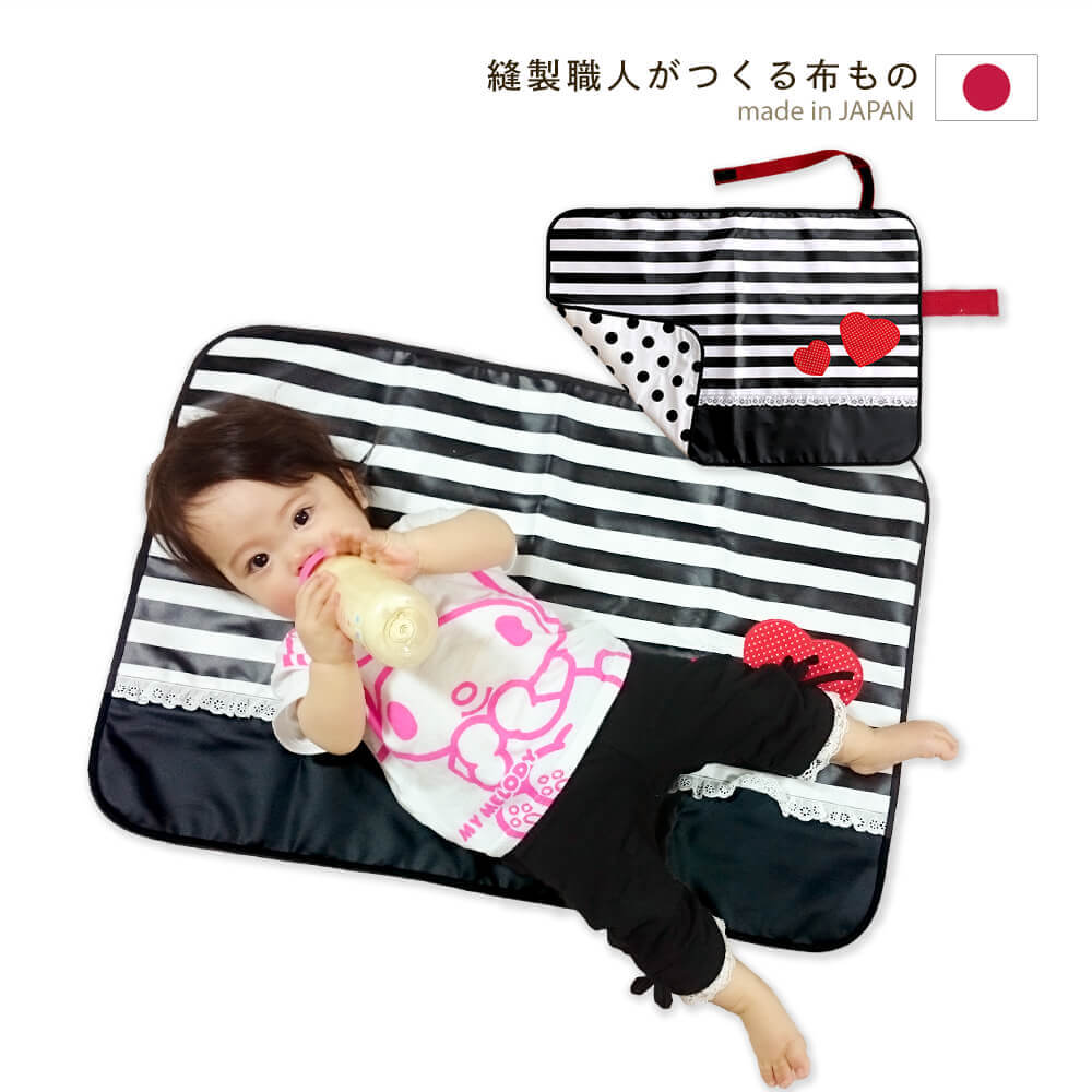 通園通学商品で人気のRock'n は〜とシリーズからベビーシリーズ登場!当店オリジナルの通園通学シリーズでも人気の白黒ボーダー柄、ハート刺繍とレースで赤ちゃんの可愛さもアップ!