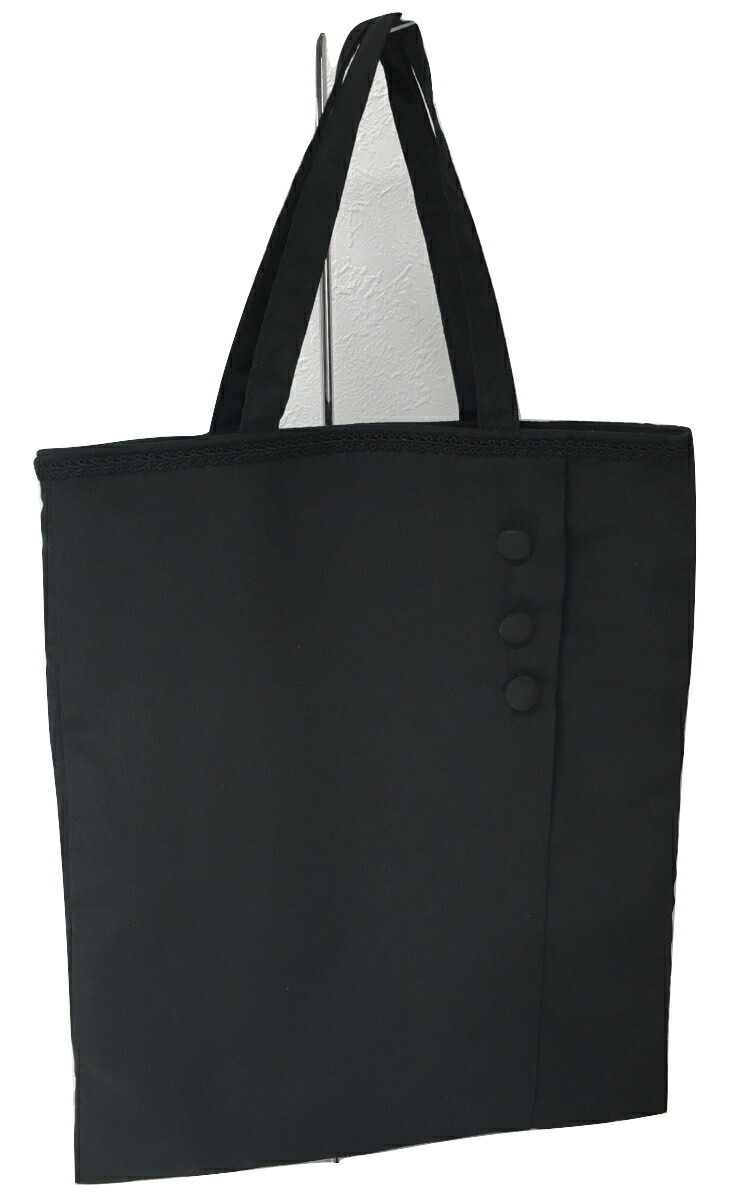 【名称】くるみボタントートバッグ 【サイズ】29×24cm【材質】表地ポリエステル100% 裏地コットン100% 【カラー】ブラック 【特徴】フロックボタンをあしらったモダンなサブバック。弔事必需品をひとまとめにしておくのに便利です