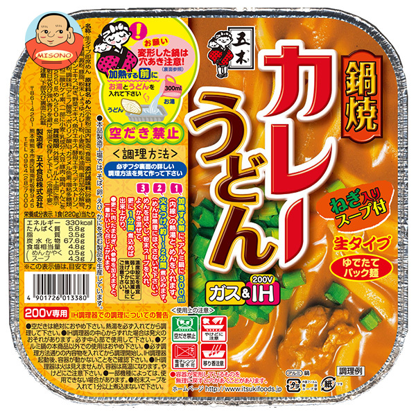 | 原材料 | めん〔小麦粉(国内製造)、食塩〕、添付調味料〔砂糖、カレールー、食塩、澱粉、豚脂、粉末しょうゆ、カレー粉、小麦粉、粉末油脂、蛋白加水分解物、昆布エキス、チキンエキス、ねぎ、野菜エキス、魚介エキス、酵母エキス、デキストリン、香辛料〕/加工澱粉、調味料(アミノ酸等)、ポリリン酸Na、カラメル色素、増粘多糖類、酸味料、香料、微粒二酸化ケイ素、(一部に小麦・乳成分・大豆・豚肉・鶏肉・りんごを含む) | | 栄養成分 | (220g当たり)エネルギー330kcal、たんぱく質5.8g、脂質3.5g、炭水化物67.6g、食塩相当量4.8g | | 内容 | カテゴリ:一般食品、インスタント食品、鍋焼うどん サイズ:170〜230(g,ml) | | 賞味期間 | (メーカー製造日より)7ヶ月 | | 名称 | 生タイプ即席めん | | 保存方法 | 直射日光及び強い香りを避け、常温で保存してください。(冷蔵不要) | | 備考 | 製造者:五木食品株式会社 熊本県熊本市南区城南町坂野945 |