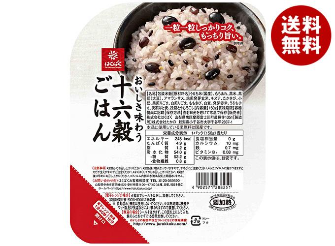 | 原材料 | うるち米(国産)、もちあわ、黒米、黒豆(大豆)、アマランサス、焙煎発芽玄米、キヌア、たかきび、小豆、黒煎りごま、白煎りごま、もちきび、白麦、発芽赤米、うるちひえ、挽割はと麦、挽割とうもろこし | | 栄養成分 | (1パック(150g)あたり)エネルギー245kcal、たんぱく質4.9g、脂質1.2g、糖質53.2g、食物繊維0.8g、食塩相当量0g、カルシウム10mg、鉄0.7mg、ビタミンB1 0.08mg | | 内容 | カテゴリ:一般食品、レトルト食品、包装米飯 | | 賞味期間 | (メーカー製造日より)180日 | | 名称 | 包装米飯 | | 保存方法 | 直射日光を避けて常温で保存 | | 備考 | 販売者:株式会社はくばく 山梨県南巨摩郡富士川町最勝寺1351 |