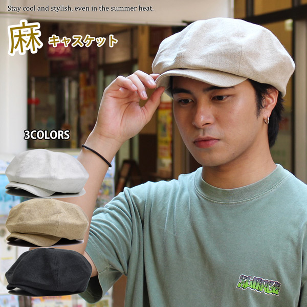 夏のコーディネートに涼しさとおしゃれをプラスしたい方におすすめの、麻100%キャスケット。
