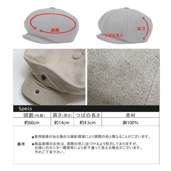 帽子説明:キャスケットリネンライト