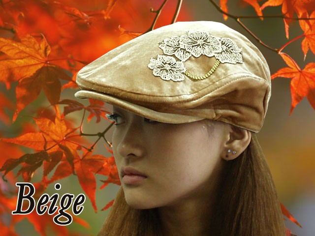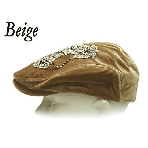 このハンチング帽子は、高級なベルベット生地を使い、さらに可愛い花柄とアクセントのチェーンでとてもお洒落に