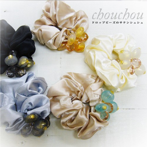 シュシュ ヘアアクセサリー ヘアアクセ ヘアアレンジ チドロップビーズのサテンシュシュ サテン ビーズ ヘアゴム 爆買