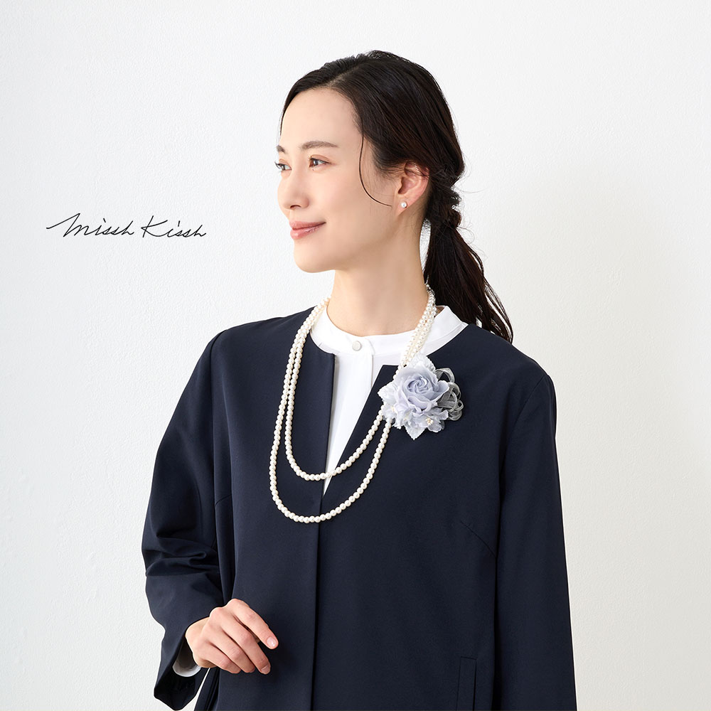 特徴 | コサージュとネックレスを使いやすいセットにしました。 厳選したオーガンジーとサテンの花びらを立体的に組み上げた人気のばらモチーフです。小ぶりながらしっかりとしたボリューム感があり、セレモニースーツにもちょうど良いサイズ。裏面にはコーサジュピンとクリップがついた2WAYタイプなので、ヘアアクセサリーとしても使用できる優れもの。 ネックレスは2連、3連と使用ができる使い勝手が良い150cmのロングネックレスと、マグネットアタッチメントで簡単に装着できる42cmのショートネックレスの2種類からお選びいただけます。 |