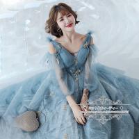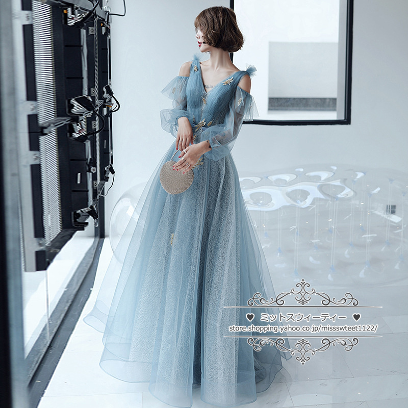 カラードレス カクテルドレス ロングドレス パーティードレス 発表会 演奏会 ステージドレス イブニングドレス フォマール 青 ブルー 袖 ファッション