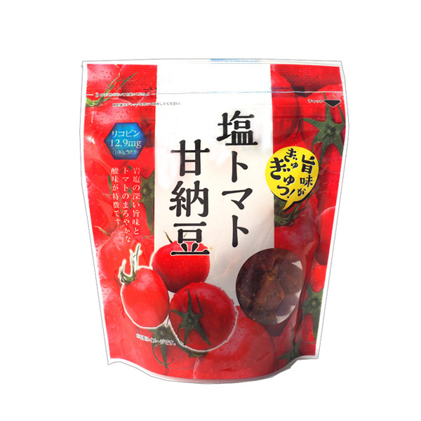 商品説明塩の辛さとトマトの甘さが相性抜群!旨味がぎゅっと詰まった一口サイズのトマトを甘納豆風に仕上げ、アンデスの岩塩をアクセントに使用しました。トマトに含まれるβカロテンやリコピンを手軽に摂取できます。保存や持ち運びに便利なチャック付です。