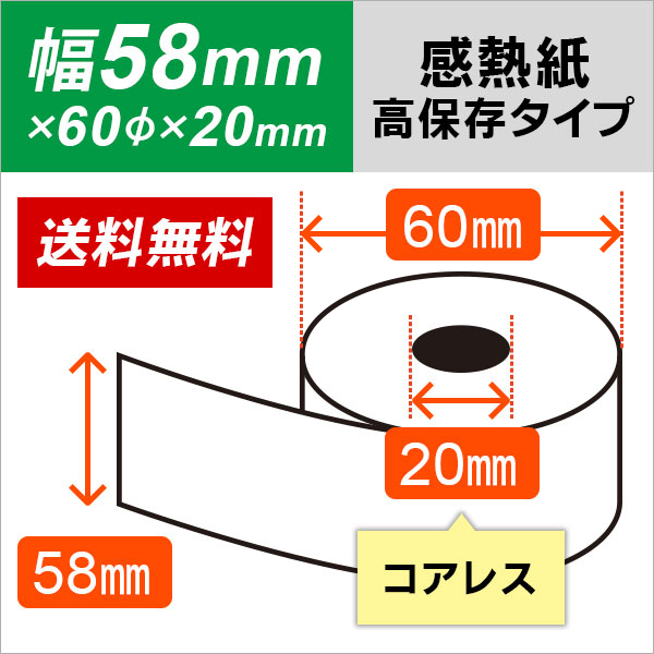感熱ロール紙 58mm×60mm×20mm コアレス 高保存タイプ 6巻