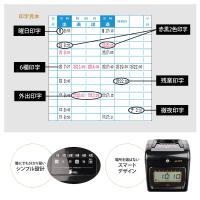 特徴 | ・印字欄を設定時刻で自動的に切り替える機能 ・印字色を設定時刻で赤色もしくは黒色に切り替える機能 ・本体内蔵の電子メロディや接続した外部時報装置を設定時刻に鳴らす機能 ・日替わり時刻を過ぎても、前日の段に退勤印字ができる徹夜機能 |