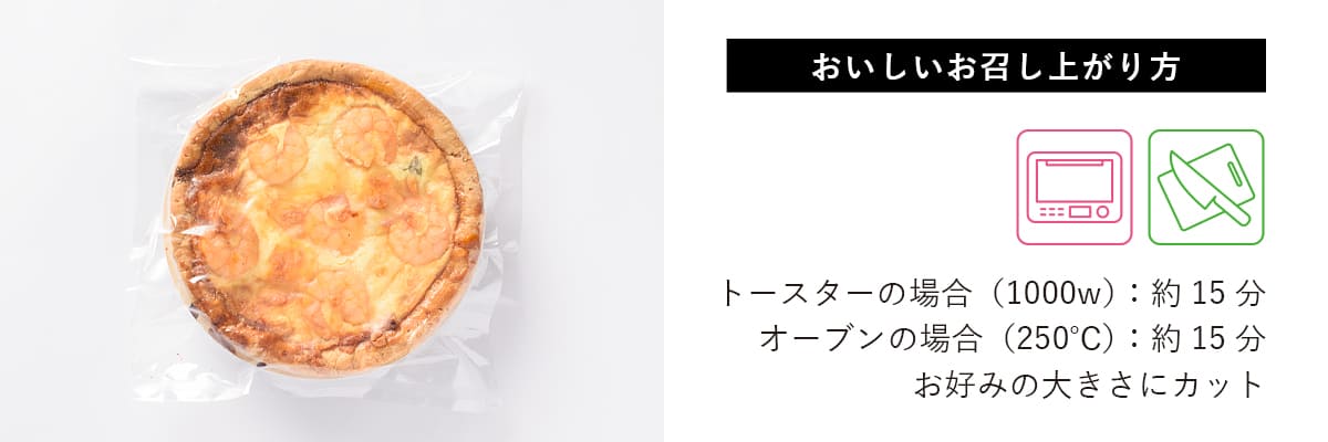 | おもてなしにもおすすめ 温かくても冷めても美味しく、その見た目の華やかさとボリュームから、オードブルにもメインディッシュにもなる人気メニュー。 解凍してそのままお召し上がりいただけますので、普段の食卓におかずとしてももちろん、おもてなしやちょっとしたプレゼントにもおすすめです。 軽く焼いていただくと、香りと食感が際立ち、作り立ての美味しさを味わえますよ。 サラダとスープと一緒にランチとして食べたり、ホームパーティーにも大活躍。白ワインや、軽めの赤ワインと合わせてもお楽しみいただけます。 | ||