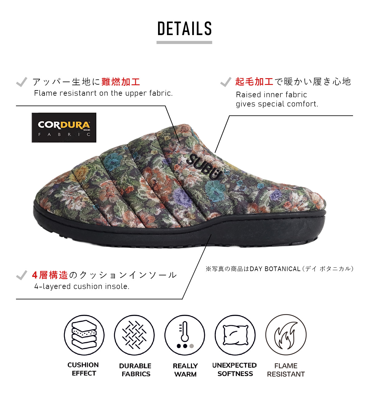 キーワード:サンダル / スリッパ / 外履き / つっかけ / あったか / ボア / 起毛素材 / CORDURA / コーデュラ使用 / キャンプ / 火の粉対策 / 燃えにくい / ミリタリー素材 / キャンプ