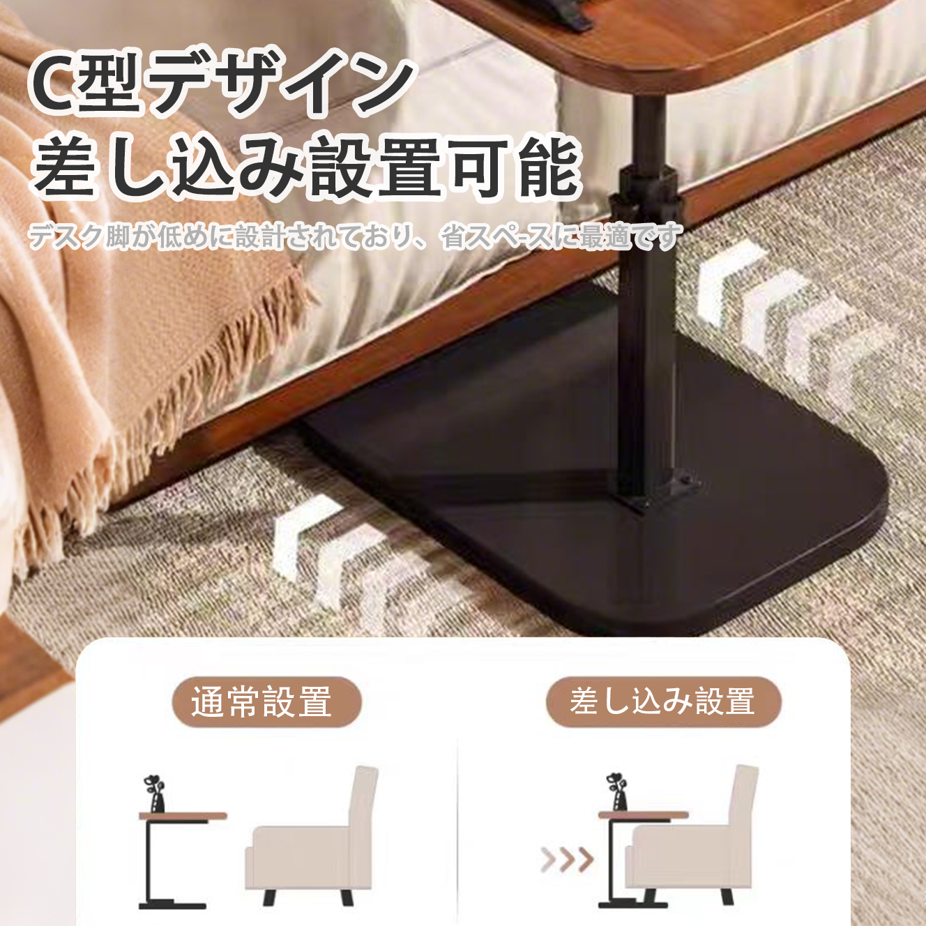 【40-80cm自由昇降】ノブ操作で片手調節可能な40-80cm昇降機構。革新的な2段収納デザインで収納力2倍。C字型ベースがソファやベッド下の隙間にもすっきり収まり、省スペースを実現。