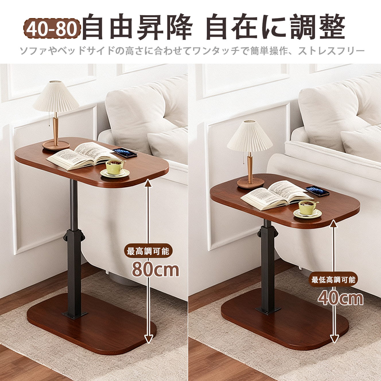 【2025年最新モデル】ノブ操作で高さ40cm〜80cmの自由調節が可能。テーブル面は上下反転・360度回転でき、座り姿勢から立ち姿勢まで、あらゆるシーンに対応。食事、読書、仕事、介護、収納など、多用途でお使いいただけます。