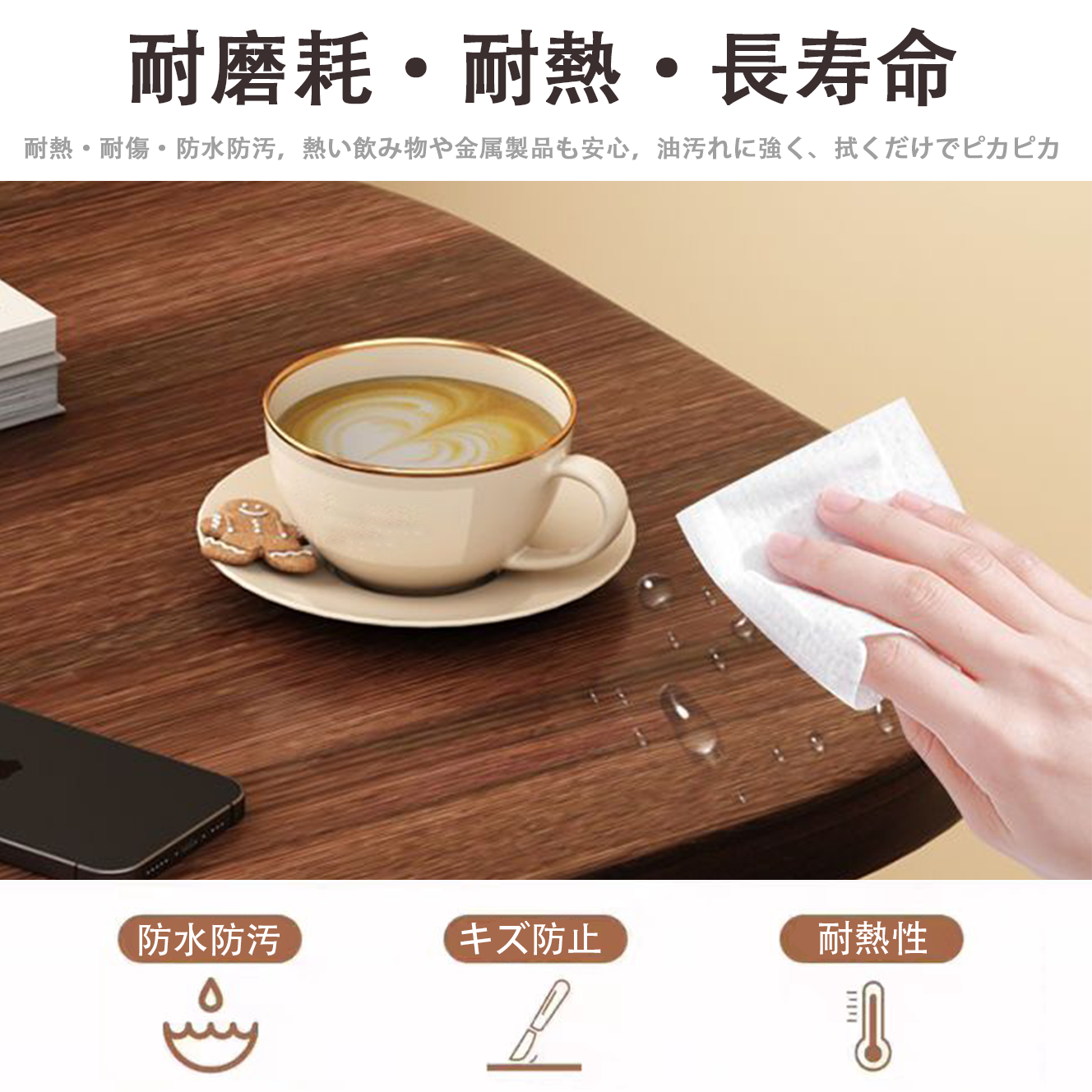 【滑り止め・耐久性に優れた天板】滑り止め加工により、最大80度の傾斜でも物が落下しにくい設計です。耐熱・耐傷・防水・防汚仕様で、汚れは簡単に拭き取れ、長期間美しい状態を保ちます。