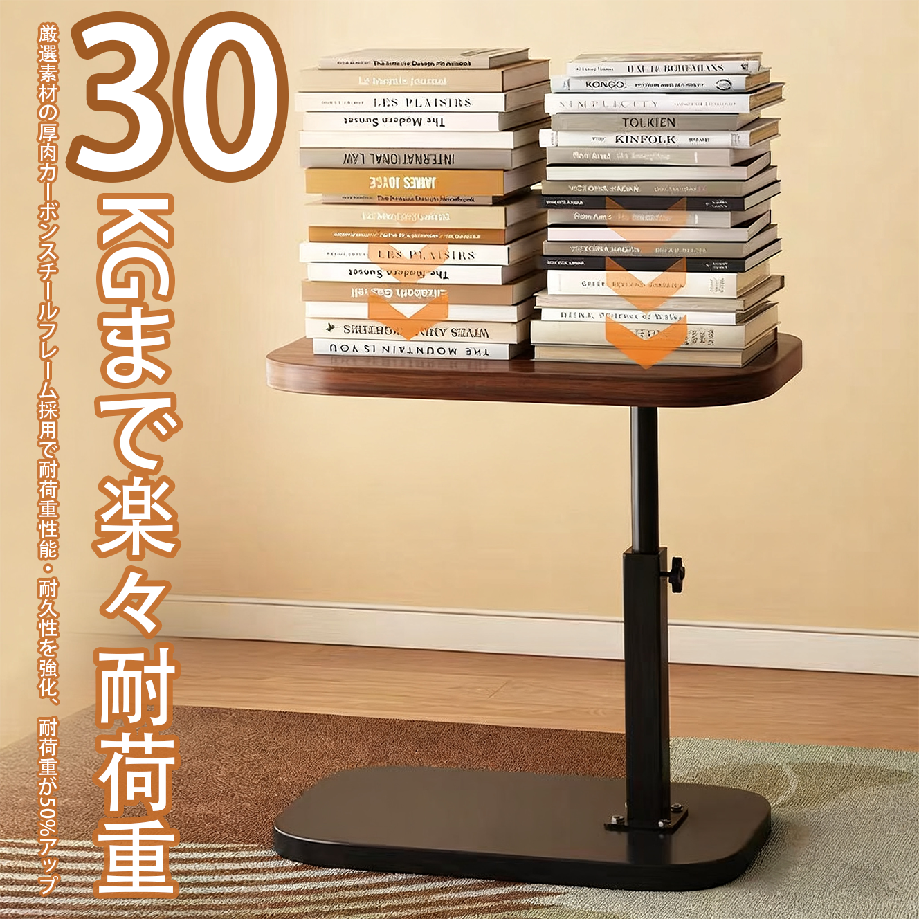 【高耐久・高耐荷】強化鋼製フレームで最大30kg耐荷重。15mm厚天板で耐圧・変形防止性能に優れ、安定性を確保。占有面積はわずか0.06m2ながら、ノートPCや書籍などさまざまな物品をしっかり収容可能です。