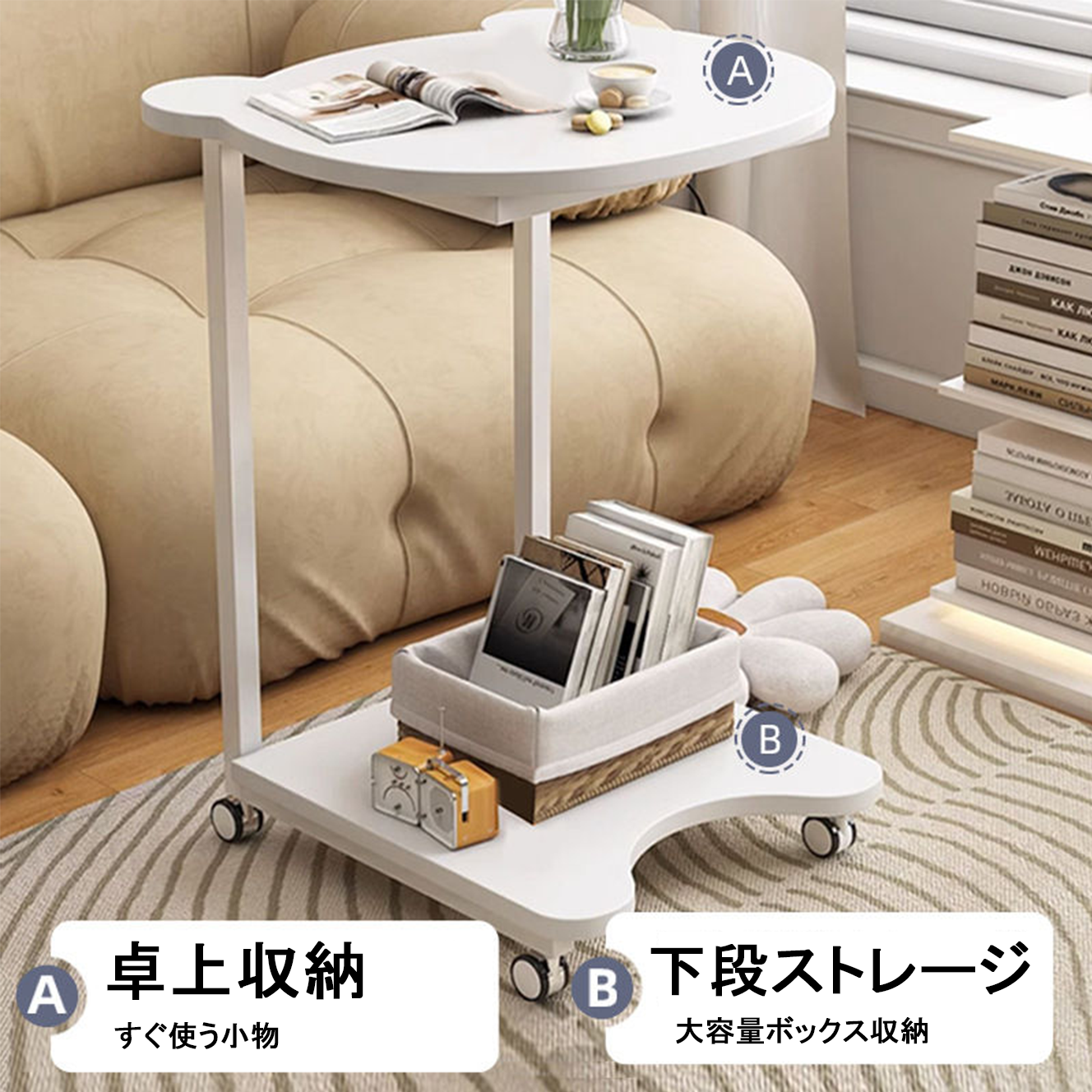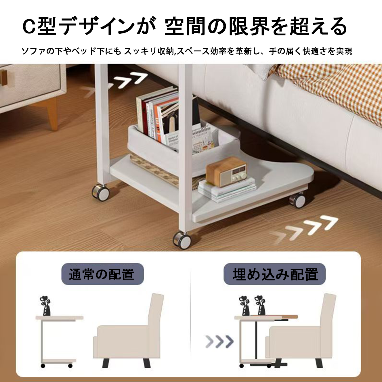 サイドテーブル キャスター付きはコ字型、ソファやベッドの下のスペースに入れ、隙間に差し込んでも使えます。場所を取らず、最大限に収納できるので、ソファのサイドテーブルやリビングのサイドテーブルとしてお使いいただけます。