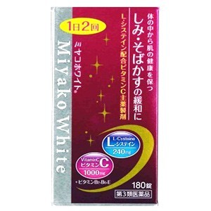 - 『ミヤコホワイト』は,しみ,そばかす,日やけ・かぶれによる色素沈着を緩和するL-システイン,天然型ビタミンE,ビタミンB2,ビタミンB6を配合した1日2回服用するビタミンC主薬製剤です。