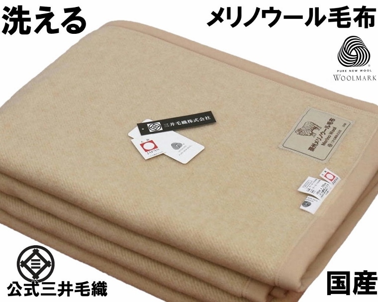 三井毛織 洗える 毛布 メリノ ウール 140x200cm シングル ウールマーク付き 日本製 ベージュ色 送料無料 E2906E