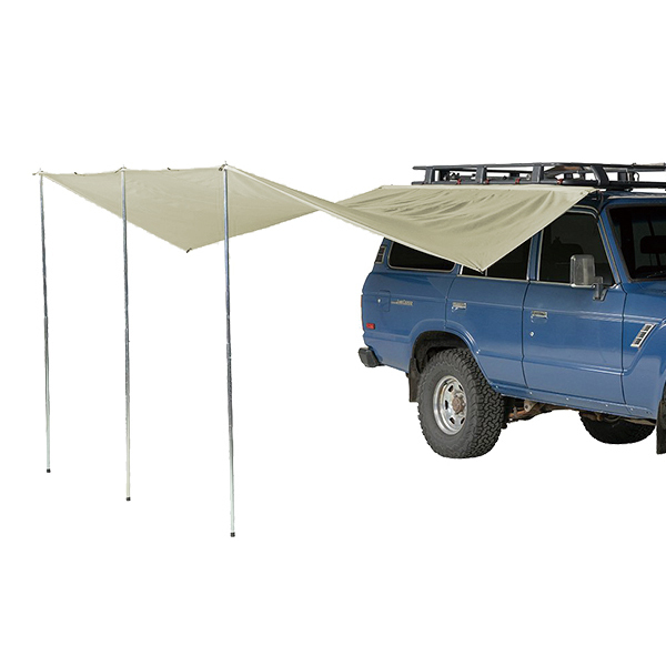 車のラックに数分で簡単かつ迅速に取り付けられ、車両から伸びて安定した快適な日よけを提供します。