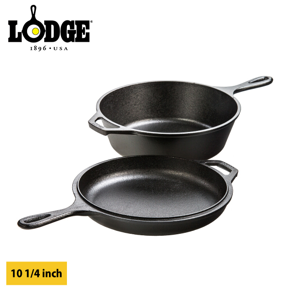 フライパンと片手鍋が一体になった万能調理器です。付属のフタはそのままフライパンとして使えますので、スペインオムレツのような厚みがあり両面焼くものでも、鍋をひっくり返せば裏側も焼けます。家庭でもダッチオーヴンが離せないといった方にも初めての1台にもおすすめです。蓋部のスキレットが新しく深型となり、よりクッキングの幅が拡がりました。スキレットと片手鍋が一体になった万能調理器です。(U.S.A.)
