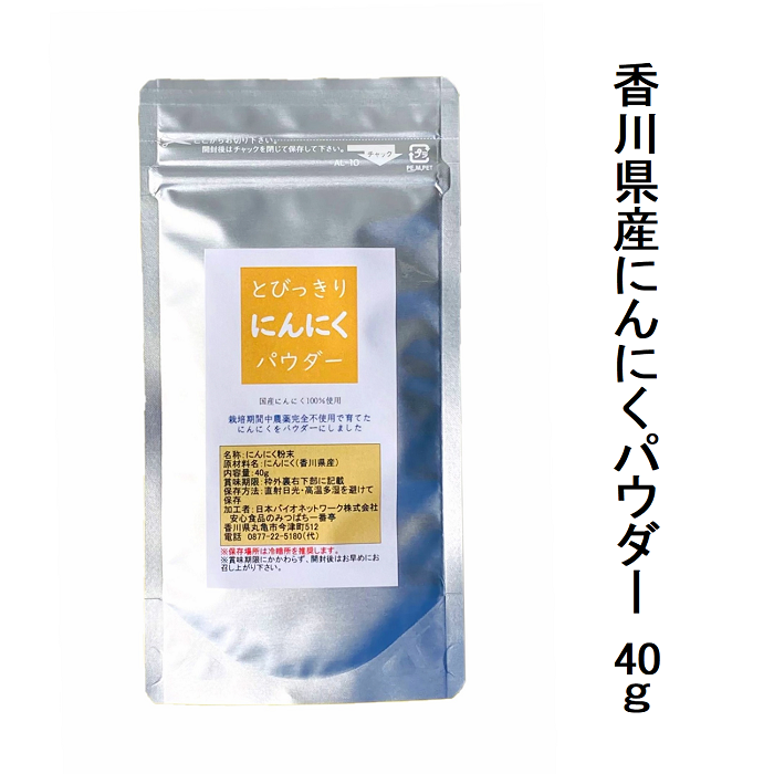 ■使用方法:あらゆる料理、お菓子、パン類等にご使用ください。栽培期間中完全農薬不使用の贅沢。生にんにく約400gを凝縮したパウダー。●妥協しない食生活を望むあなたへ質のよい食品で満足したい。香川県産・栽培期間中農薬、除草剤、化学肥料、有機肥料を一切不使用のにんにくだけを使いました。●旨味と栄養を守る製法生のにんにく約400gを低温除湿乾燥で40gに濃縮。0.2℃単位の微調整で香りや色を守り、混ざりやすい100メッシュの微粉末に。●まずは試せる使い切りサイズ料理の風味を豊かにするこの良質なパウダーで、いつもの食卓がより充実した満足感に満たされます。