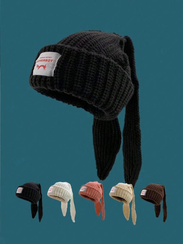1個 かわいいウサギ耳付き女性用ニット帽、秋冬用、暖かいイヤーマフとロゴパッチワーク、ニットキャップ、日常使いからハロウィンまで適用