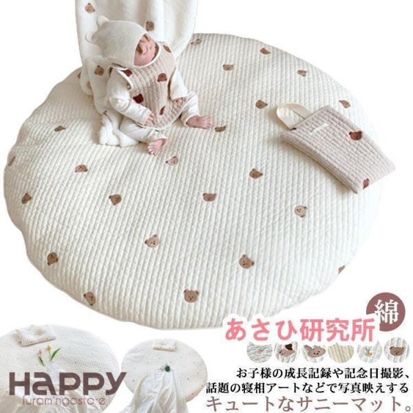 サニーマット ベビー ラグ マット 円形 ごろ寝 寝相アート 月齢フォト マット 綿 赤ちゃん お昼寝マット 刺繍 クマ 花柄 ウサギ リス オリーブ