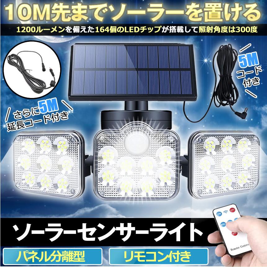 ソーラーライト ソーラーセンサーライト パネル 分離型 3灯式 リモコン 10Mコード 防犯ライト 防災ライト 壁掛け式 164LED 高輝度 屋外照明 玄関 駐車場 SATOU