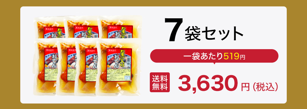 大根・玉子・小判揚・ごぼう巻・こんにゃく・竹輪・昆布のおでん種7種を上品であっさりとしてコクのある出汁をたっぷりと染み込ませて作り上げました。