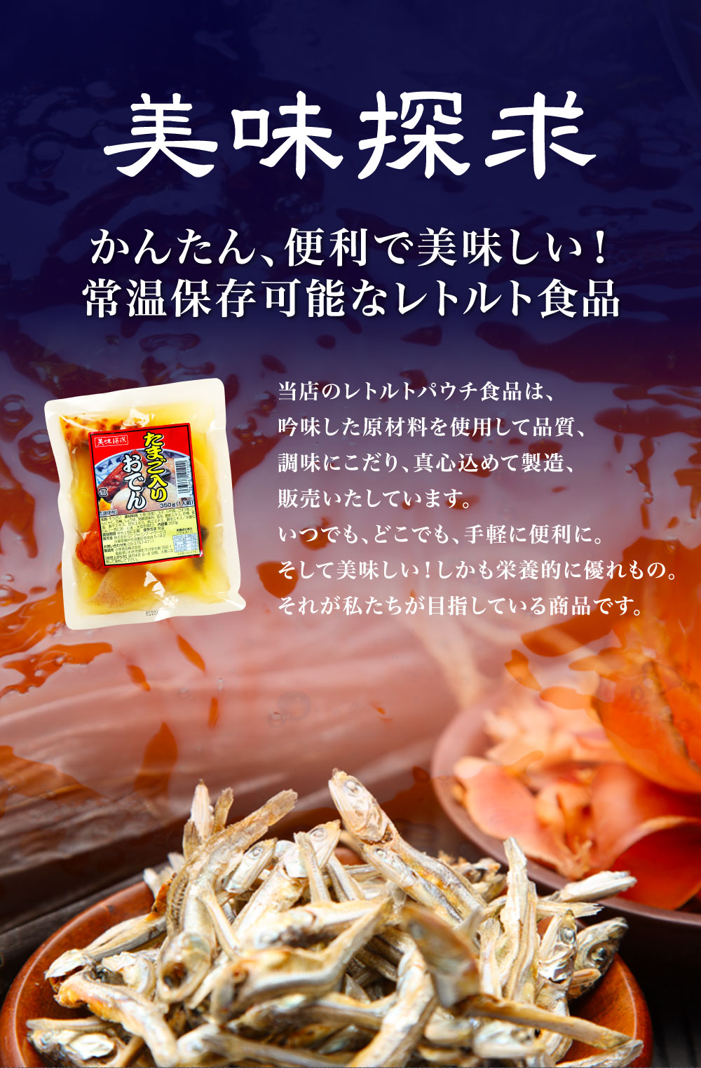 常温で長期保存可能な災害用備蓄食品や通販商品などの業務用加工食品を製造しています。
