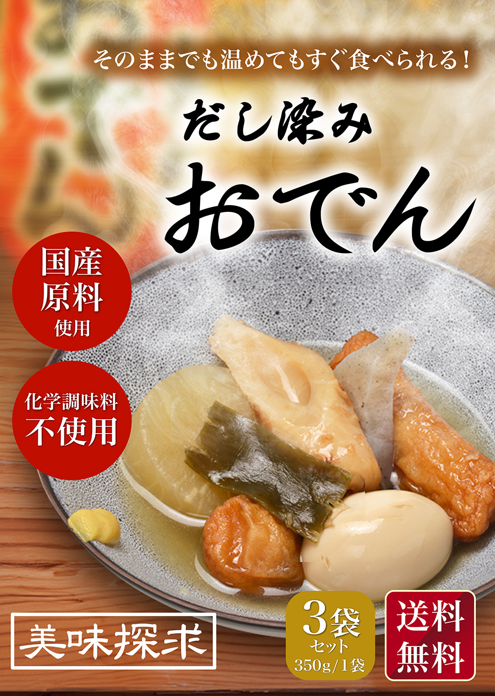 かつお節、いりこ、ほたて、昆布の魚介エキスで丁寧に出汁を取りじっくり煮込んだ風味豊かなおでんです。
