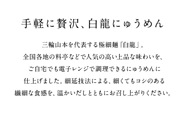 | 器にめんとお湯を入れ、ラップをせずに電子レンジで加熱。めんつゆ(だし)と具材を入れて出来上がり。お鍋でも調理していただけます。 |