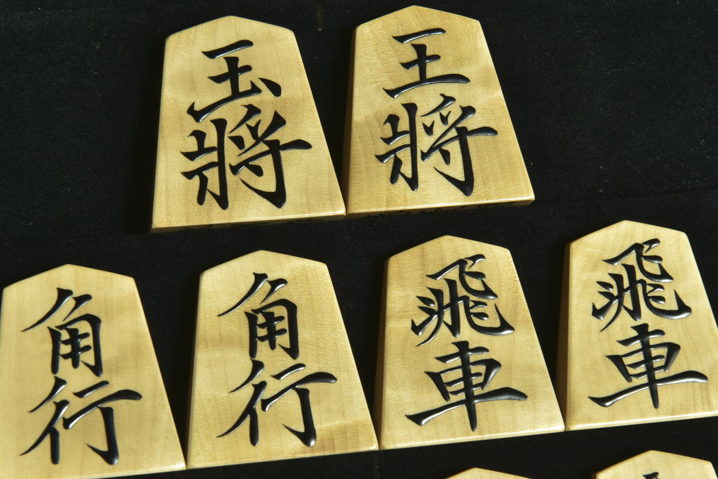 水明作 菱湖書 御蔵島本黄楊 杢 盛揚 平駒箱、駒袋付