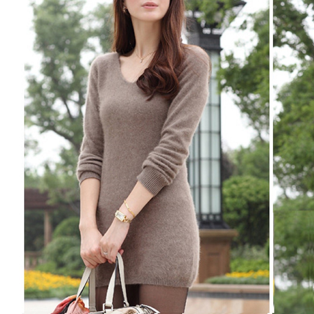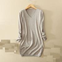 Vネック、ウール混チュニック、ライトベージュ