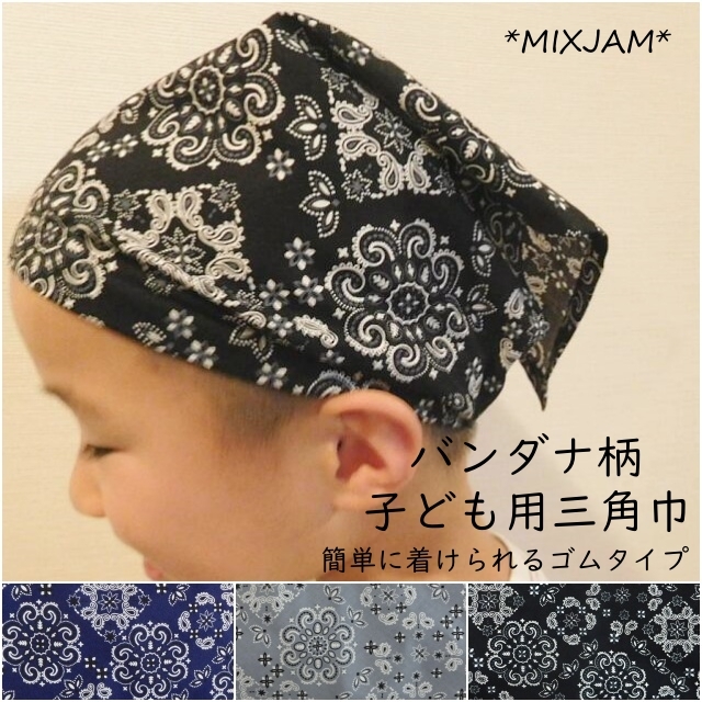 三角巾 ゴム 子供 バンダナ柄 子供用三角巾 子ども用三角巾 子ども ゴム付き 紺 グレー 黒